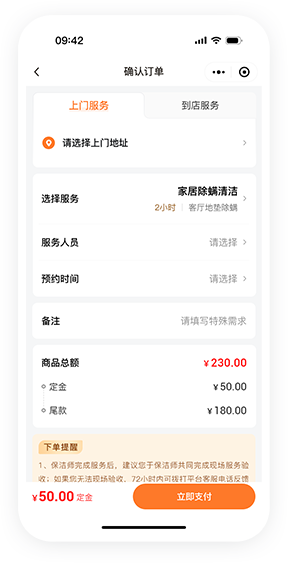 全款预约:客户需在下单预约服务时支付全部服务款项,为商家提供了资金保障。