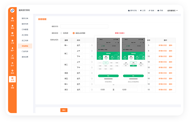 自定义排班模板功能,商户根据自身业务需求,灵活设定服务人员的可占用时间表。